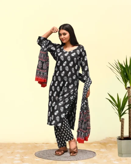 Discover the Lotus Elegance Suit, a chic 3-piece cotton suit set with a yellow lotus print dupatta. Elegant, breathable, and perfect for festive or casual wear.
