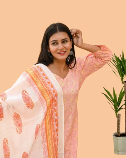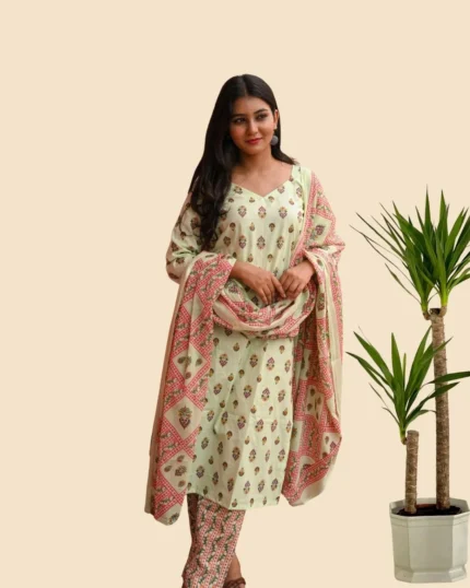 The Celeste Cotton Aura is a luxurious 3-piece suit set, crafted from a fine blend of muslin and cotton to offer unmatched softness, comfort, and breathability. Designed for women who appreciate both style and ease, this ensemble features a graceful silhouette that drapes effortlessly, making it perfect for festive occasions, casual gatherings, or refined daily wear. Its lightweight texture and timeless elegance ensure it remains a versatile addition to your wardrobe, blending the sophistication of muslin with the everyday charm of cotton.