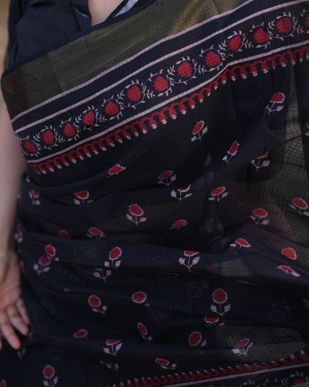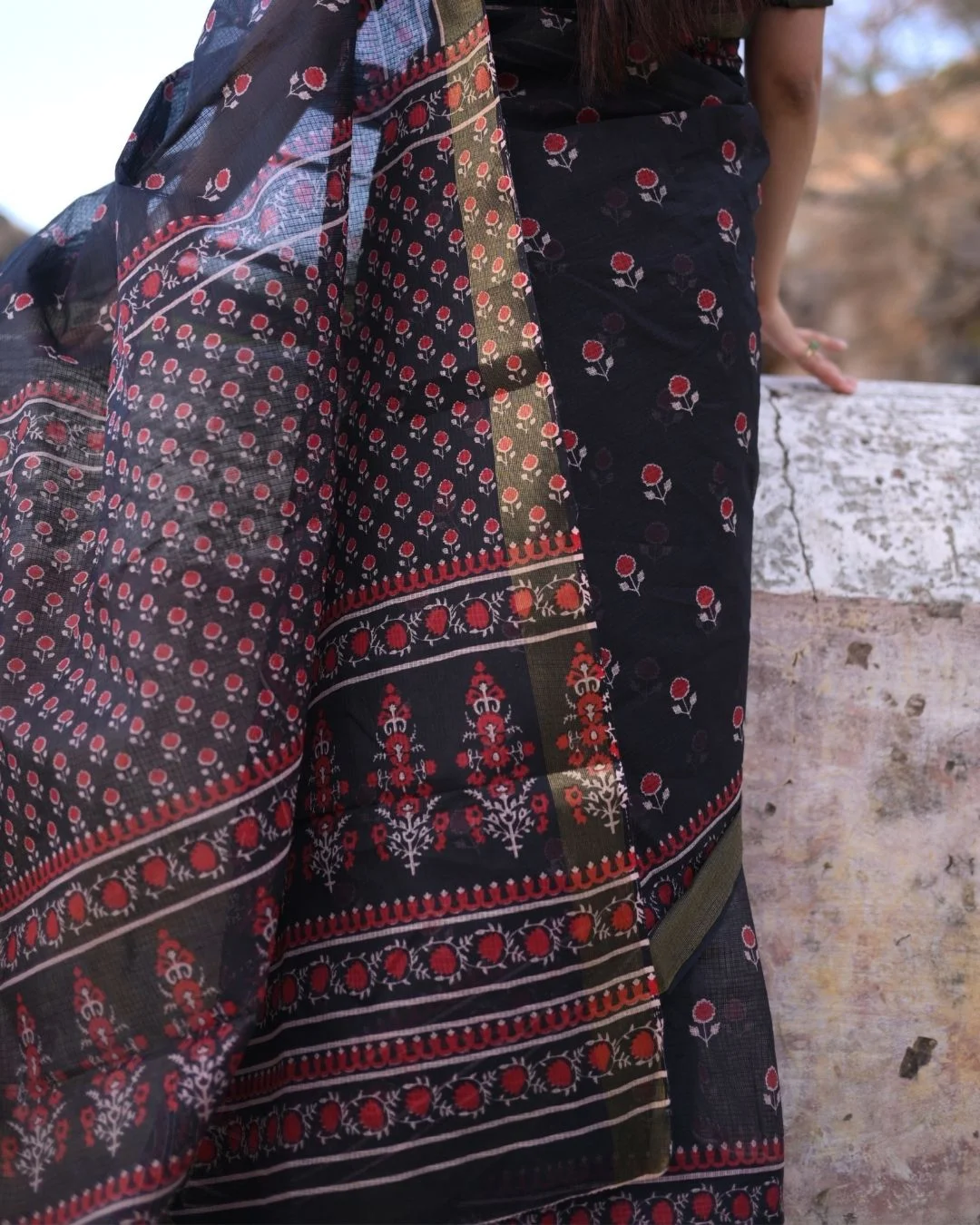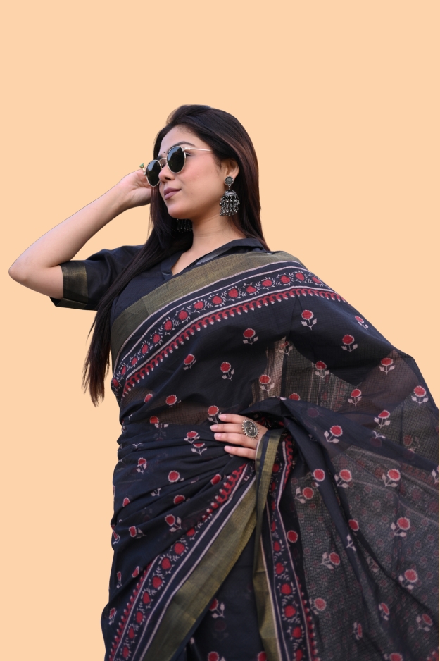 Step into refined charm with the Elegant Bloom Saree, a premium creation in authentic Kota Doriya fabric. Known for its feather-light texture and effortless drape, this saree features a rich black base embellished with striking red floral booti designs, symbolizing timeless beauty. The intricate designer border adds sophistication, while the lined detailing at the pallu provides a graceful finishing touch. With a total length of 6.25 meters, including a 0.75-meter unstitched blouse piece, this saree offers versatility for personalized styling. Perfect for festive gatherings, cultural celebrations, or formal occasions, the Elegant Bloom Saree beautifully balances tradition with modern elegance.