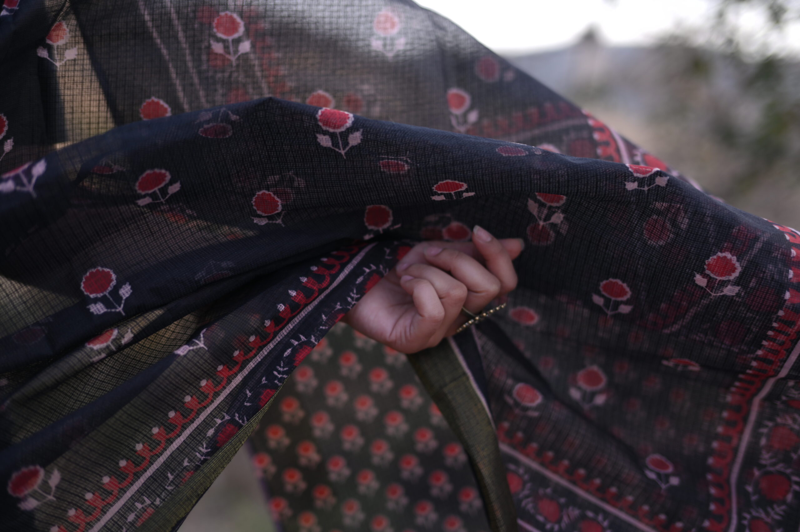 The Elegant Bloom Saree is a premium Kota Doriya creation featuring a rich black base with striking red floral booti designs. Enhanced with a designer border and lined pallu detailing, it comes with a 6.25 m length including a 0.75 m blouse piece. Perfect for festive gatherings, cultural celebrations, or formal occasions.