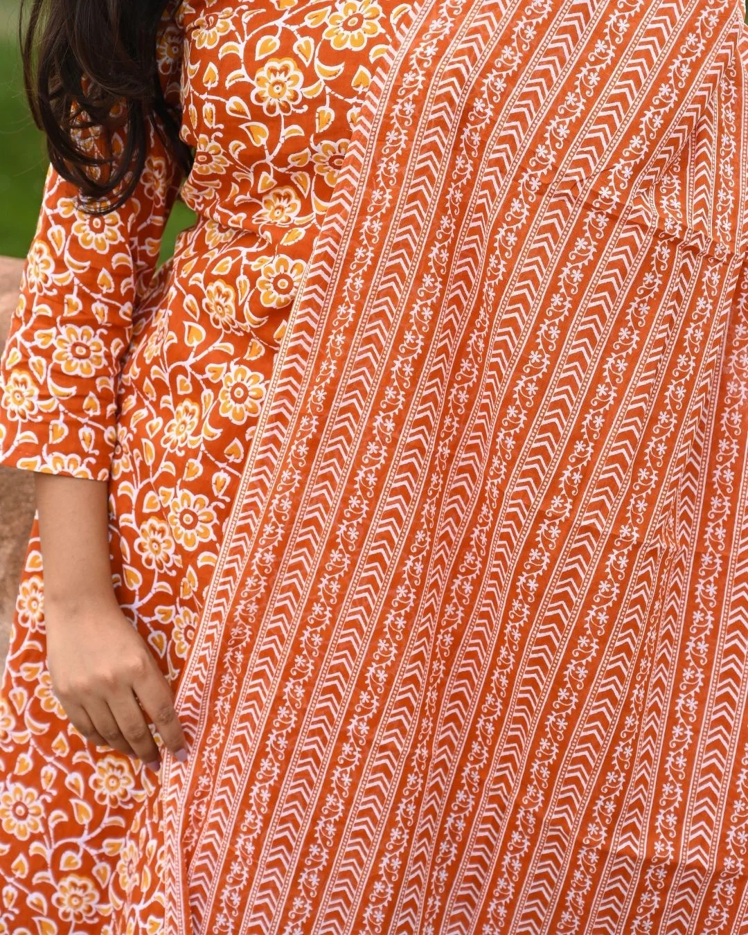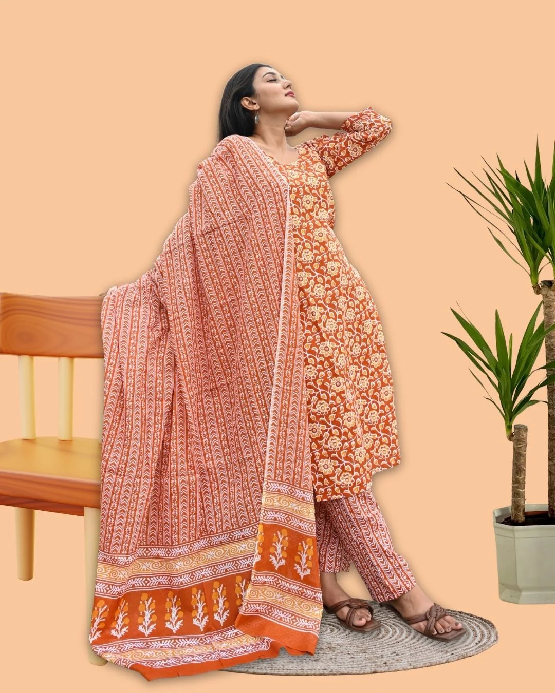 The Floral Harmony Suit is a vibrant 3-piece cotton suit set that blends charm, comfort, and sophistication. Featuring a soft cotton kurta with matching trousers and a captivating orange dupatta adorned with intricate floral screen prints, this ensemble adds a burst of color to your ethnic collection. Crafted from breathable cotton for all-day ease, it offers the perfect balance of traditional elegance and modern style. Ideal for festive gatherings, casual outings, or everyday wear, this floral cotton suit set with dupatta is designed to keep you stylish and comfortable on every occasion.