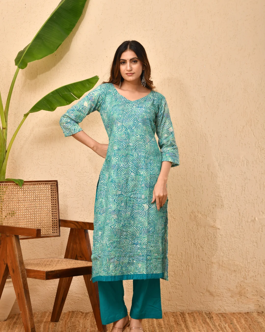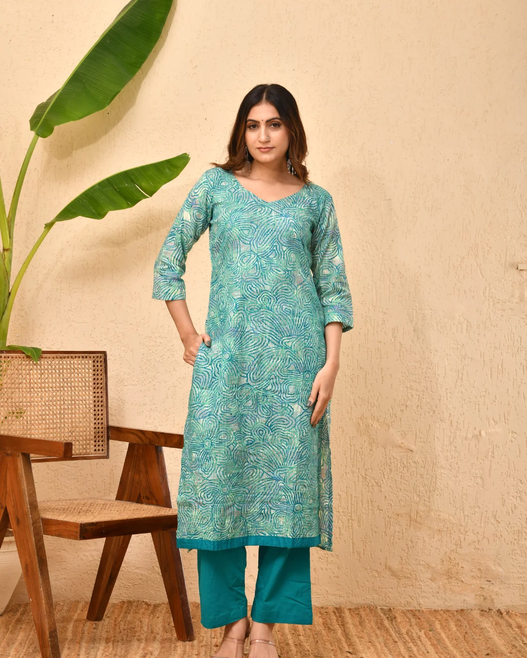 The Green Elegance Set is a sophisticated 3-piece suit set crafted to merge modern design with timeless grace. Featuring a rich green base adorned with intricate digital patterns and delicate lace accents, this ensemble exudes refined charm. The look is completed with a flowing chiffon dupatta, beautifully enhanced with detailed machine thread embroidery for an elegant finish. Designed to offer both comfort and style, this green suit set with embroidered dupatta is perfect for festive occasions, family gatherings, or special celebrations. Its fine craftsmanship and chic detailing make it a versatile addition to any ethnic wardrobe.