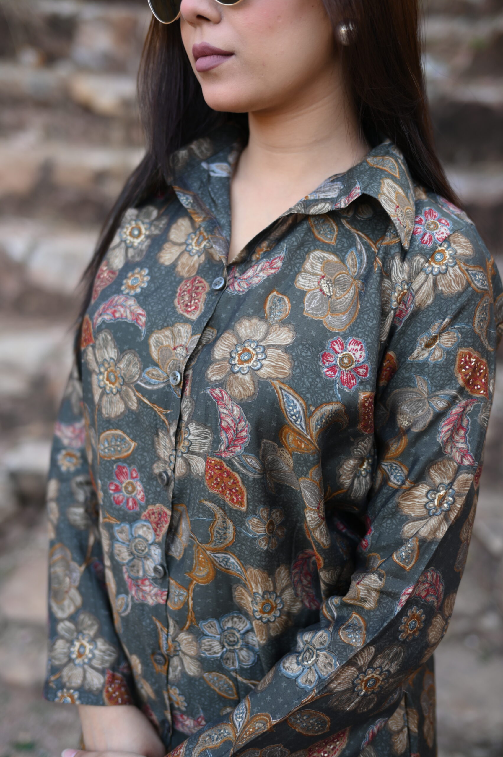 The Grey Flora Set is a chic cotton-muslin co-ord ensemble in a refined grey base with elegant floral patterns. Featuring full sleeves for a sophisticated touch, it’s perfect for office wear, day outings, or casual gatherings with effortless style.