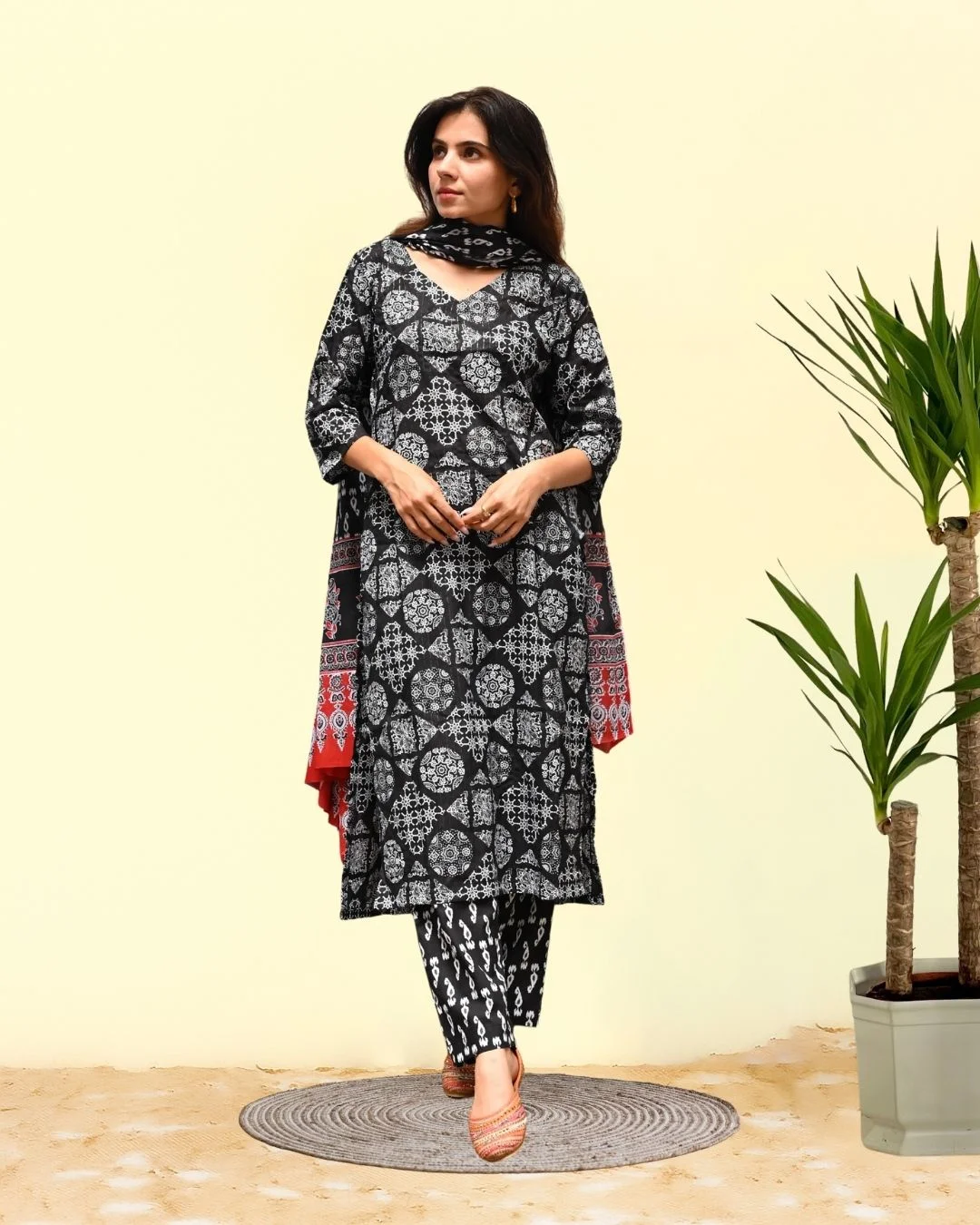 The Midnight Block Set is an elegant black 3-piece suit set crafted from premium 60×60 cotton, ensuring comfort and durability. Designed in a timeless black shade, the kameez and salwar offer a smooth, breathable fit perfect for day-to-night wear. The highlight of this ensemble is the striking black dupatta, adorned with a bold block graphic pattern that adds a modern and artistic flair. Blending traditional tailoring with contemporary design, this versatile suit set is ideal for both formal occasions and casual gatherings, making it a stylish essential in any wardrobe.