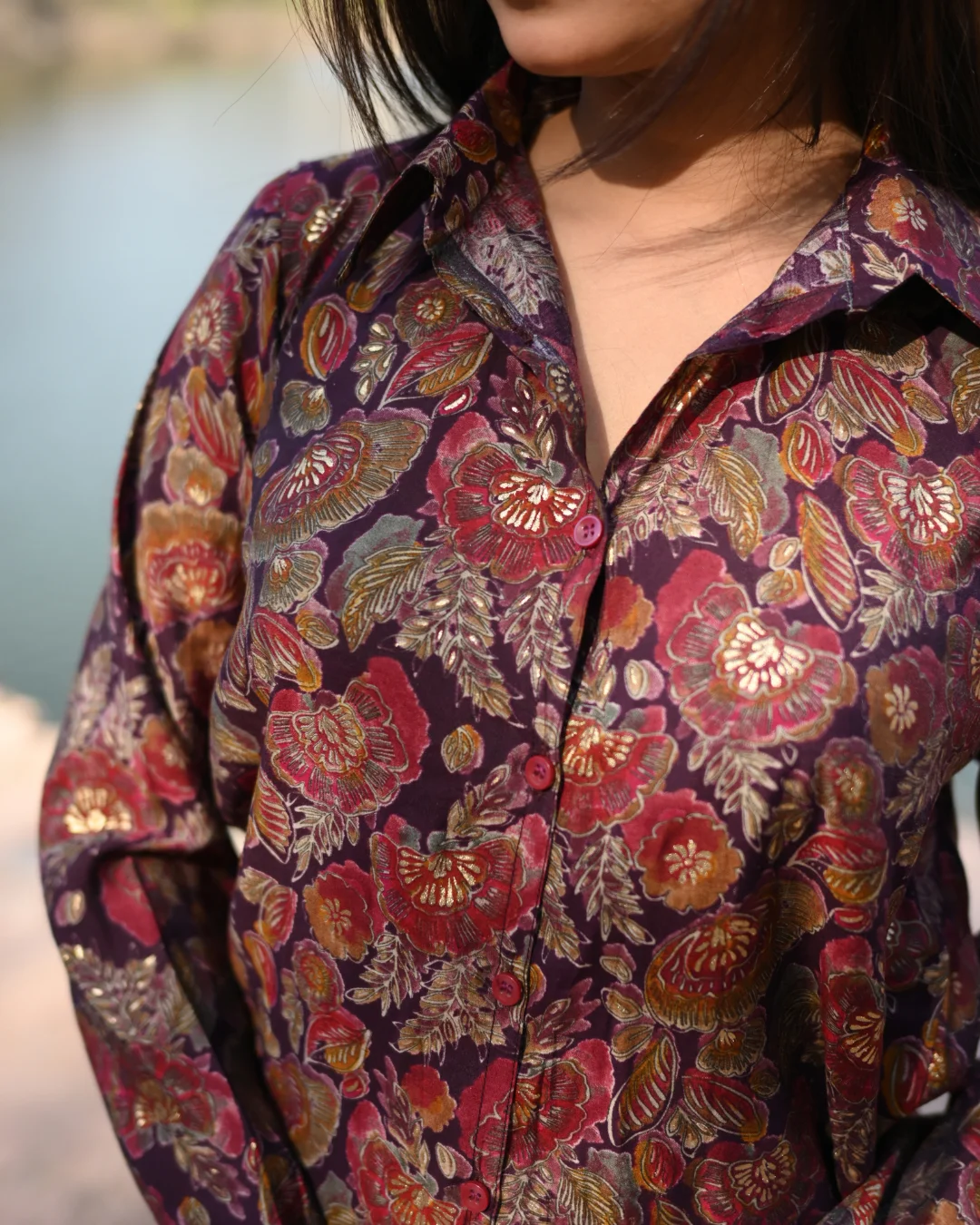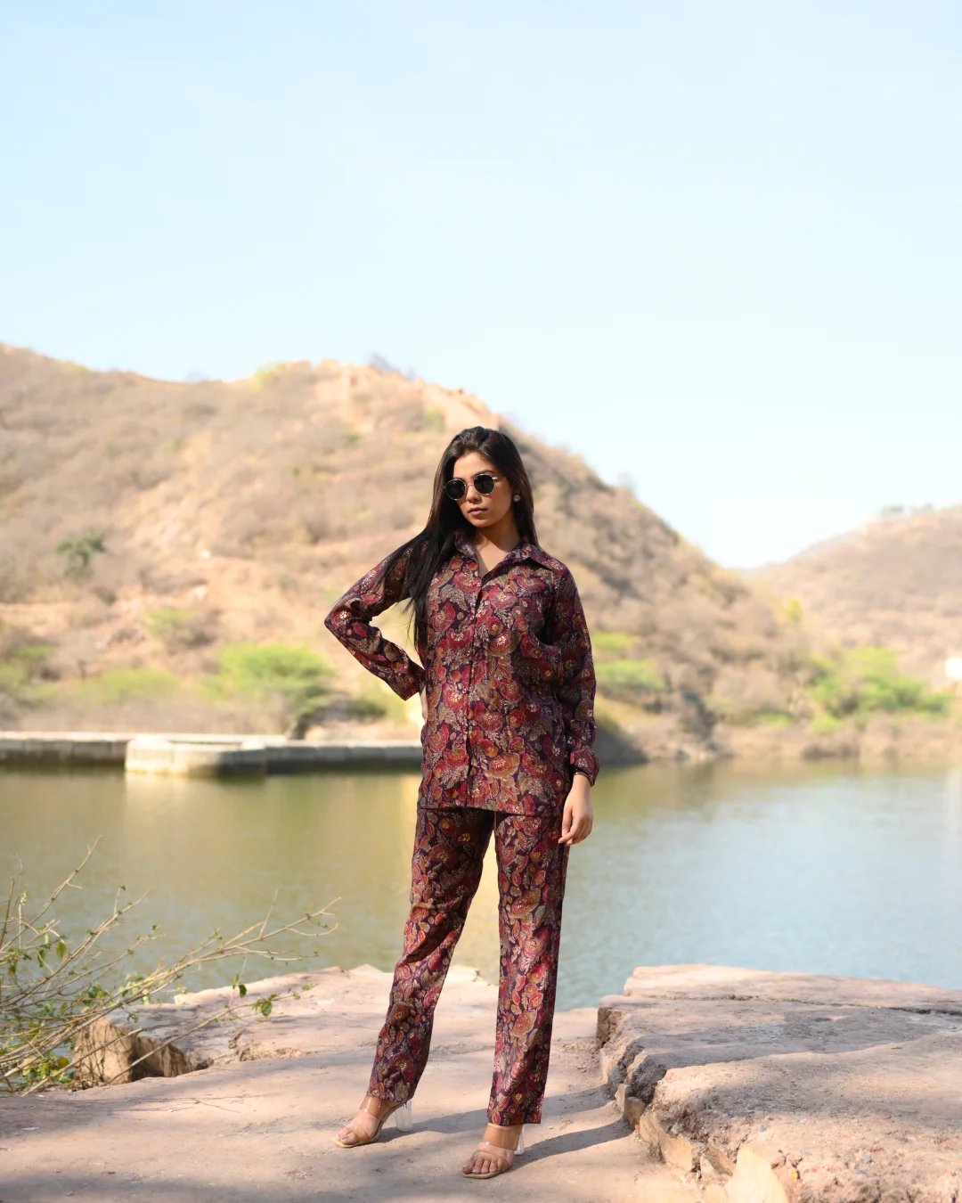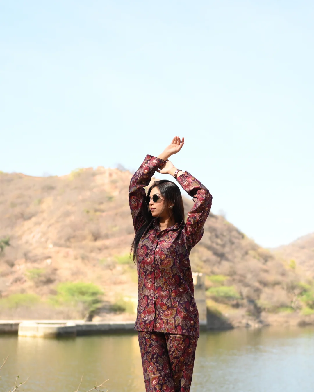 The Orchid Bloom Set is a chic and versatile co-ord ensemble crafted from a premium blend of cotton and muslin for unmatched comfort and style. Designed with a rich reddish-purple base and adorned with elegant floral patterns, this full-sleeve co-ord set is perfect for both office wear and day outings. Its modern silhouette, breathable fabric, and timeless floral charm make it an effortless choice for women who value elegance with ease.