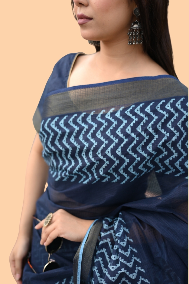 Shop Royal Breeze Saree – Dark blue Kota Doriya with light blue designs, designer border & blouse piece (6.25m). Lightweight, elegant & timelessly stylish.