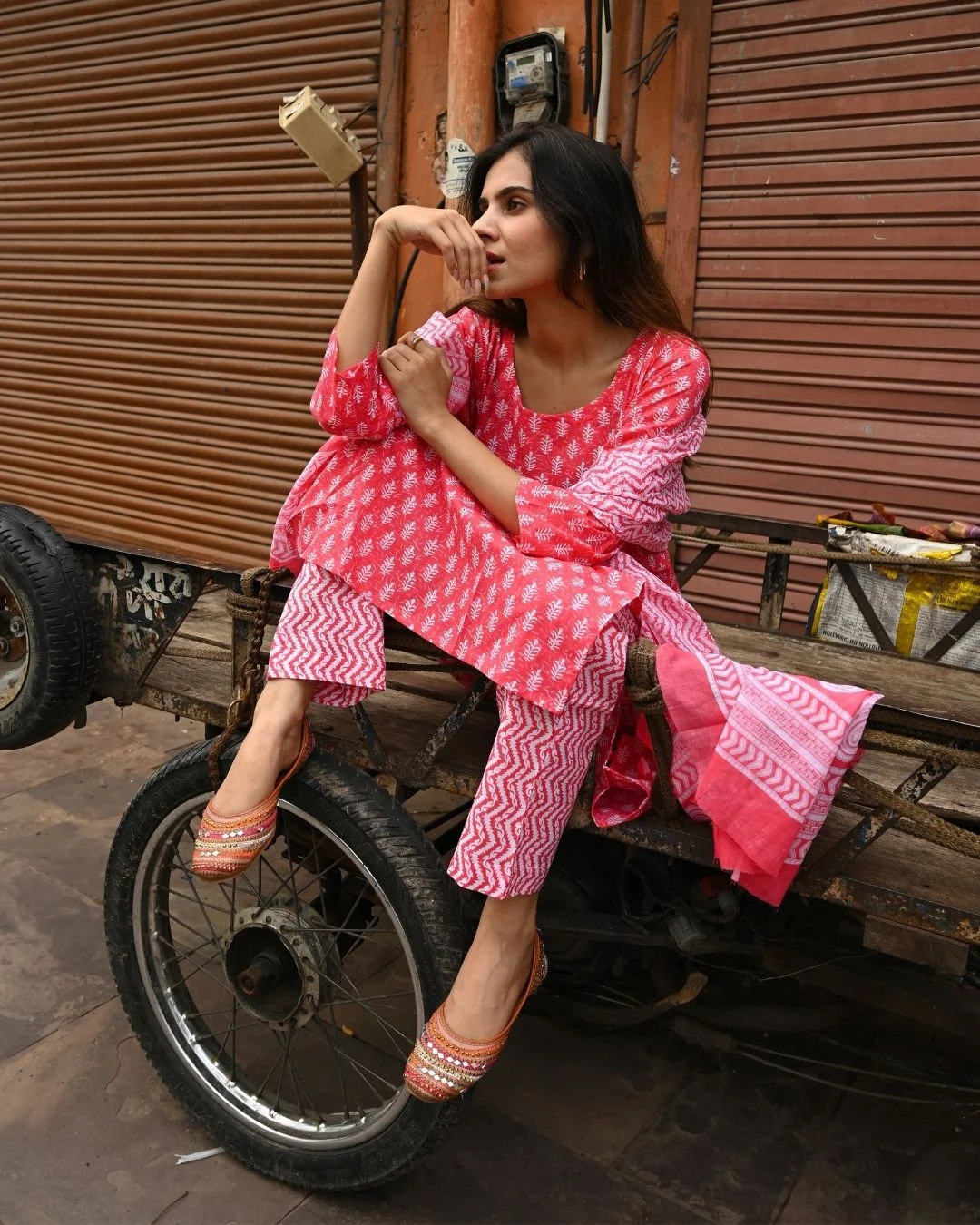 & Free ShippingThe Strawberry Bloom Set is a delightful 3-piece cotton suit in strawberry pink and white, adorned with intricate block prints. Paired with a matching screen-printed dupatta, it blends traditional artistry with modern comfort. Perfect for festive gatherings, casual outings, or everyday wear.