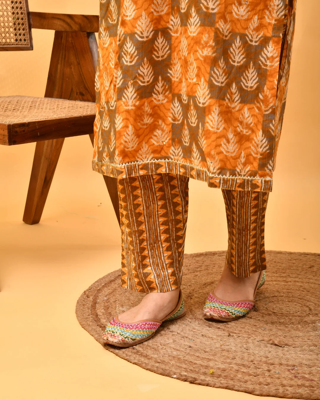 The Sunset Harmony Suit is a luxurious cotton 3-piece suit set crafted from premium-quality fabric for unmatched comfort and elegance. Designed in a vibrant yellow-brown palette, the kurta and salwar are adorned with intricate block prints and delicate tie work, showcasing timeless craftsmanship. The ensemble is completed with a hand-printed cotton dupatta that adds a graceful finishing touch, making it perfect for both festive celebrations and casual gatherings. Blending traditional artistry with modern sophistication, this yellow-brown cotton suit with block print dupatta is a versatile choice for a refined and stylish look.