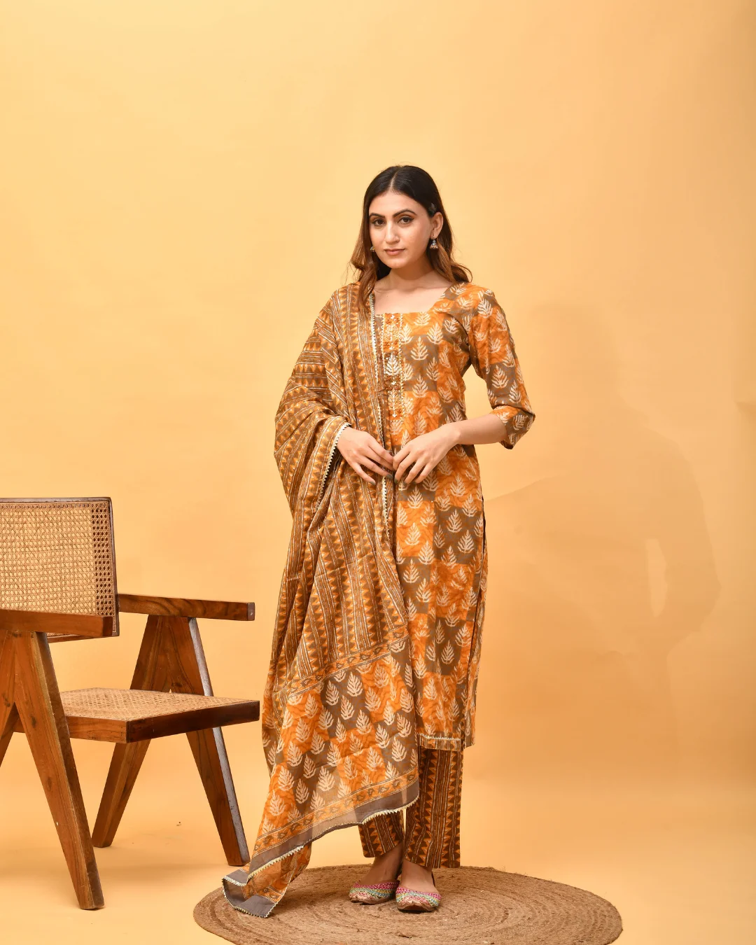 & Free ShippingThe Sunset Harmony Suit is a vibrant 3-piece cotton set in a yellow-brown palette, featuring intricate block prints and delicate tie work. Paired with a hand-printed cotton dupatta, it blends tradition with modern elegance. Perfect for festive celebrations, casual gatherings, or stylish everyday wear.